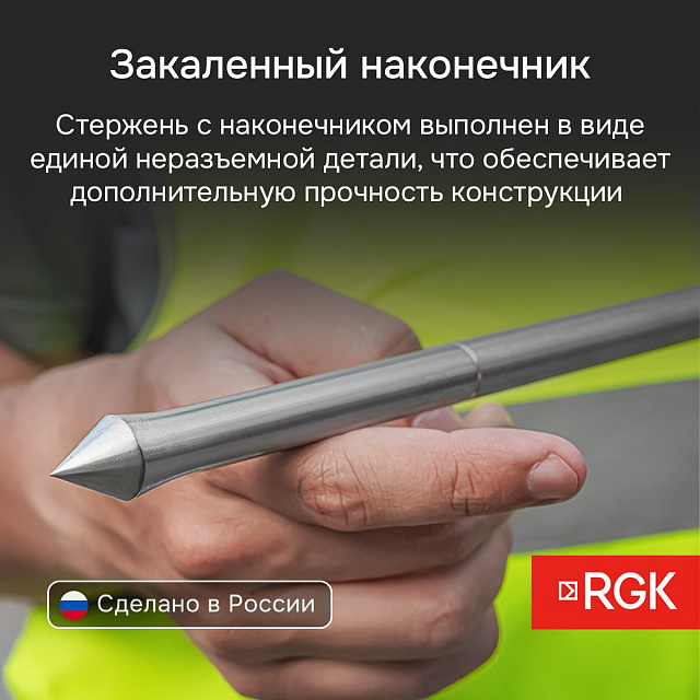 Для работы с различными материалами динамический плотномер RGK ДПУ оборудуется съемным рабочим узлом. Для сыпучих материалов и грунта используется стержень с наконечником, а для асфальтобетонных смесей – конусная насадка на ограничителе.